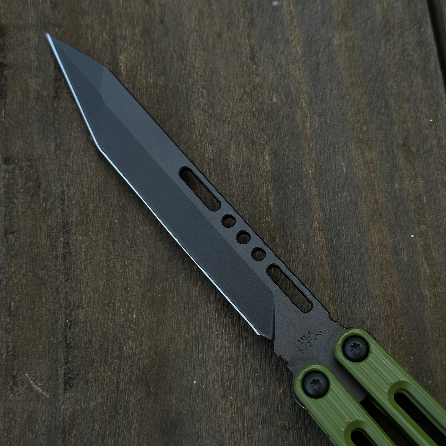 Practice with trainer over soft surface. Avoid objects that can be nicked/dented and surfaces that can scratch or dent the Balisong.