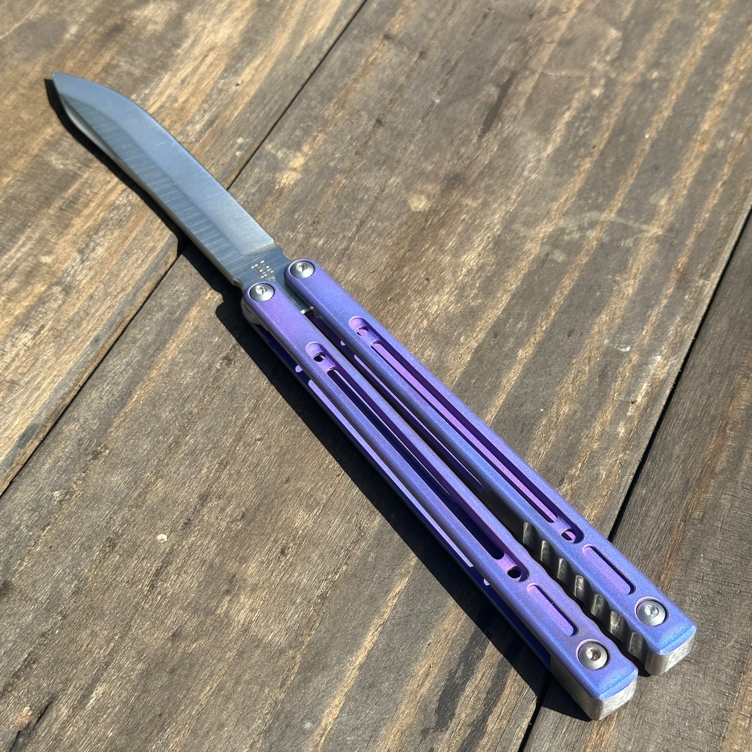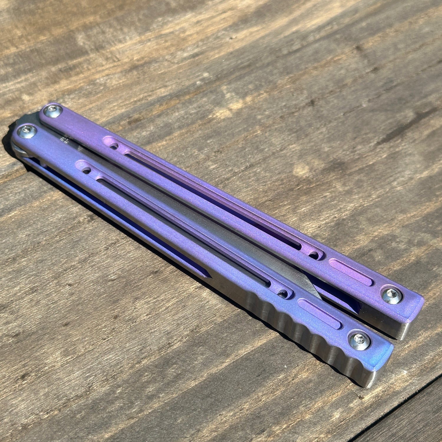 Using Titanium Chadwich Handles and S45 Steel Blade, this blade is tuned and sharpened for an amazing, and exhilarating, flipping experience.
